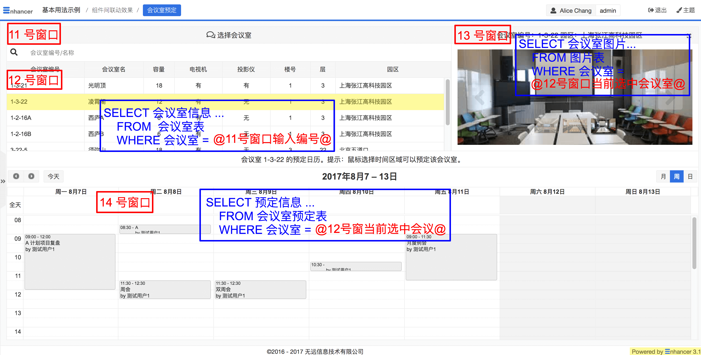 例如基本用法示例中的会议室预定演示,只需在每个窗口绑定数据源时指明依赖的变量,那么在系统运行时,当这些变量的值发生变化时,会自动刷新依赖窗口,进而呈现联动效果。