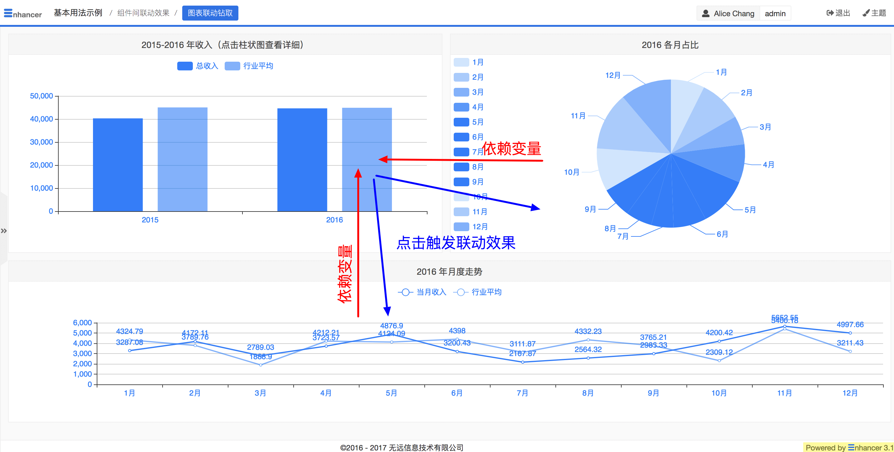 窗口之间的联动,是非常必要且常用的交互场景。Enhancer 对窗口行为变化做了统一抽象,凭借完备对变量体系和事件动作响应机制,可以让开发者非常方便地实现各种联动效果。