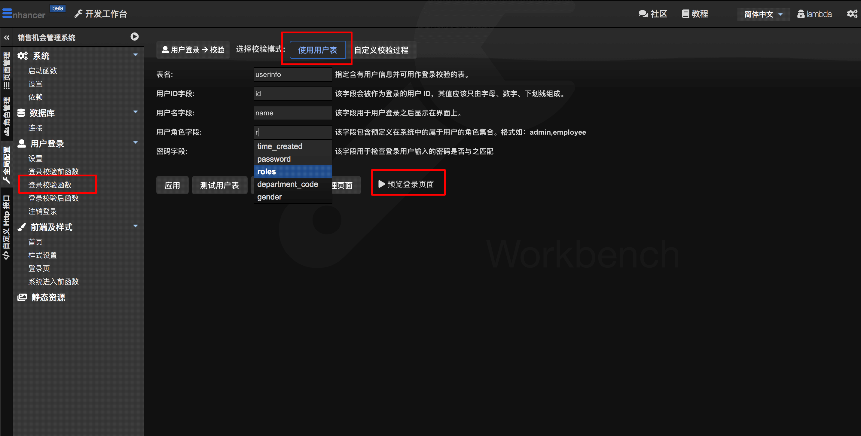 然后,打开 全局配置 --> 用户登录 --> 登录校验函数 配置面板,选中 使用用户表,设置登录校验字段的映射关系,如下图: